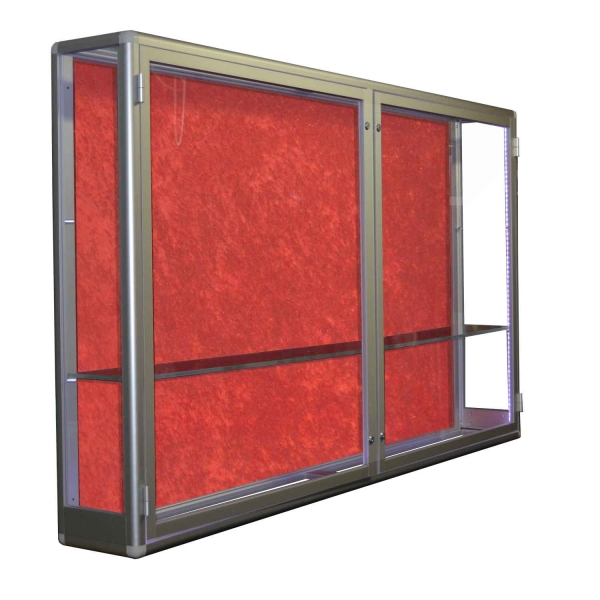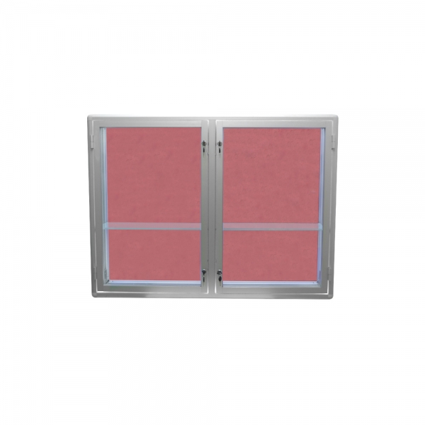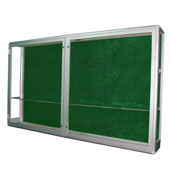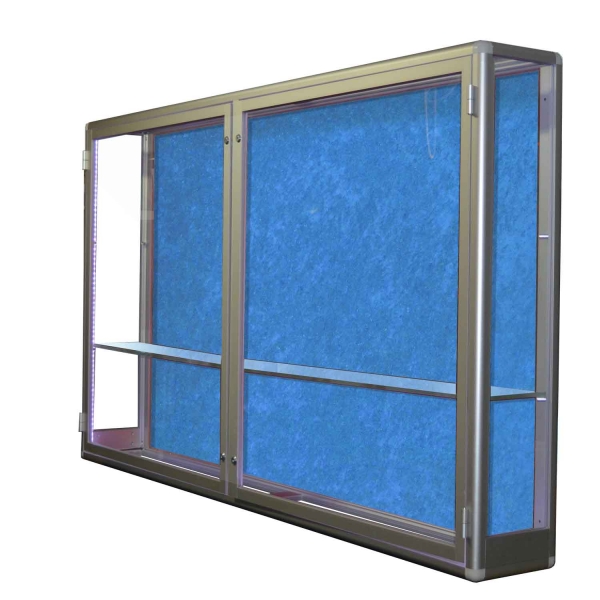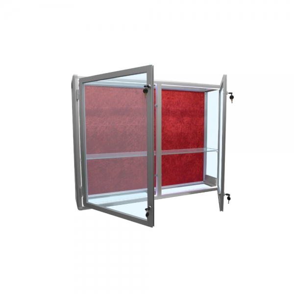 Aluminiowa gablota na puchary, drzwi dwuskrzydłowe otwierane na boki zamykane na klucz. Wyposażona w półki szklane. Tył gabloty standardowo wykonany z białej blachy. jako opcja może być dodatkowo wyściełana tkaniną.