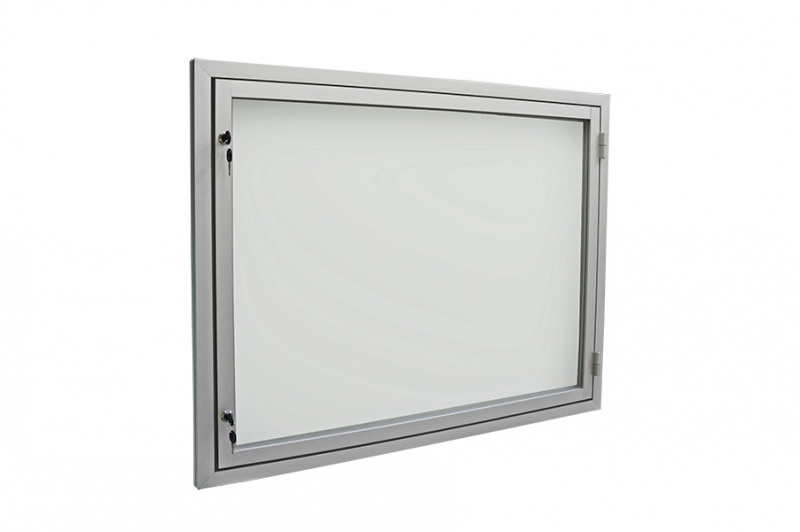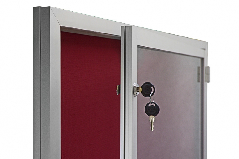 Gablota ogłoszeniowa JB3,2 K wykonana z grubościennych profili aluminiowych anodowanych na kolor srebrny. proces anodowania wpływa na trwałość, odporność na ścieranie a także estetyczny wygląd. Rama gabloty wykonana jest z kształtowników łączonych ze sobą pod kątem 45 stopni, tworząc kąt prosty. Gablota wyposażona jest w jedno skrzydło drzwi otwierane na bok i wyposażone w dwa zamki. Skrzydło gabloty przeszklone jest certyfikowanym szkłem hartowanym o grubości 4mm, które jest umieszczone w ramie z anodowanych profili aluminiowych. W gablotach zastosowany jest szereg uszczelek tzn. w strzydle drzwi między samą szybą a ramą drzwi oraz pomiędzy szkrzydłem i ramą gabloty.