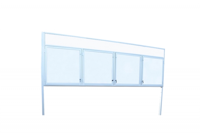 Gablota wolnostojąca, zewnętrzna, aluminiowa, dwustronna, czteroskrzydłowa otwierana na boki z fryzem.