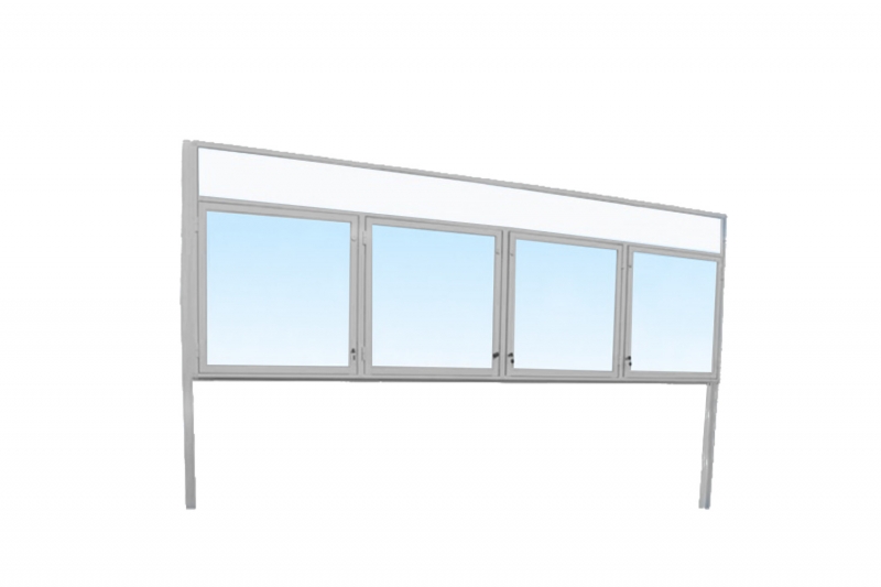 Gablota wolnostojąca zewnętrzna, aluminiowa dwustronna, czteroskrzydłowa, wolnostojąca otwierana na boki WDCZB13-F jest to bardzo elegancka gablota informacyjna stworzona na potrzeby prezentacji materiałów w miejscach publicznych. Gablota czteroskrzydłowa zewnętrzna, w standardzie wykonywana jest z aluminiowych profili o grubości 13 cm anodowanych wraz z słupkami na kolor srebrny mat. Profile aluminiowe, które w całości tworzą solidną i trwałą ramę umożliwiają nam produkowanie gablot czteroskrzydłowych, ogłoszeniowych w większych rozmiarach niż standardowe (podane poniżej). Do produkcji gablot aluminiowych, otwieranych na boki używane są szyby hartowane grubości 4 mm. Górę gabloty stanowi mleczna szyba plex o wysokości 17 cm, opatrzona logo bądź napisem wg specyfikacji klienta (w wariancie z oświetleniem logo jest podświetlane od tyłu). Dno niniejszej gabloty ogłoszeniowej po obu jej stronach stanowi płyta magnetyczna produkcji niemieckiej, którą standardowo obustronnie malujemy proszkowo na kolor biały. Informacyjna gablota zabezpieczana jest patentowymi zamkami. Prezentowany typ gabloty WDCZB13-F jest gablotą informacyjną o przeznaczeniu zewnętrznym, w związku z czym jest ona należycie zabezpieczona systemem uszczelek, które sprawiają, że staje się odporna na warunki atmosferyczne. Gablota zewnętrzna dodatkowo wyposażona jest w otwory wentylacyjne aby zapobiec parowaniu i zamarzaniu szyb. Co do zasady wysokość słupków ustalamy w porozumieniu z Klientem. W standardzie oferujemy wymiary słupka aluminiowego anodowego na kolor srebrny mat : 40 mm x 60 mm x 2,5 mm o długości podstawowej 234 cm oraz 50-60 cm przedłużka. Gablota na nogach nie rdzewieje i jest odporna na działanie czynników atmosferycznych. W celu zapewnienia Naszym Klientom produktu najwyższej jakości do produkcji naszych gablot wykorzystujemy wyłącznie części polskich, duńskich oraz niemieckich z wymaganymi certyfikatami jakości, co dodatkowo daje rękojmię wysokiej trwałości naszych produktów.