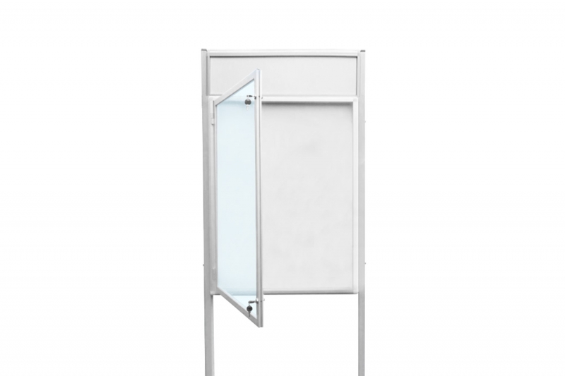 Gablota aluminiowa zewnętrzna, wolnostojąca dwustronna, jednoskrzydłowa otwierana na bok z fyrzem o grubości gabloty 13cm