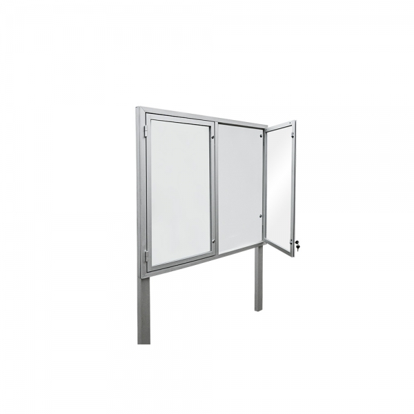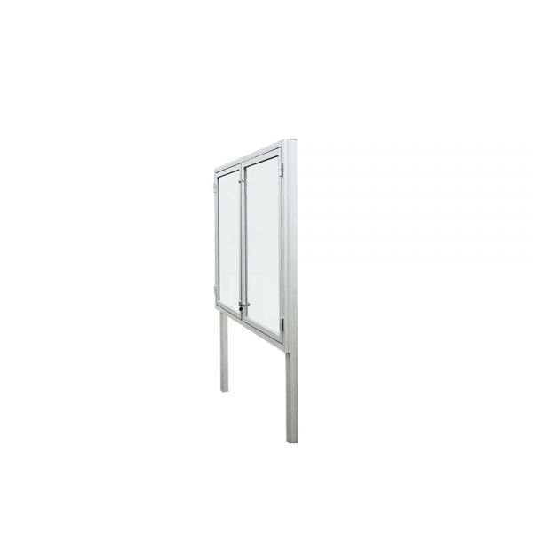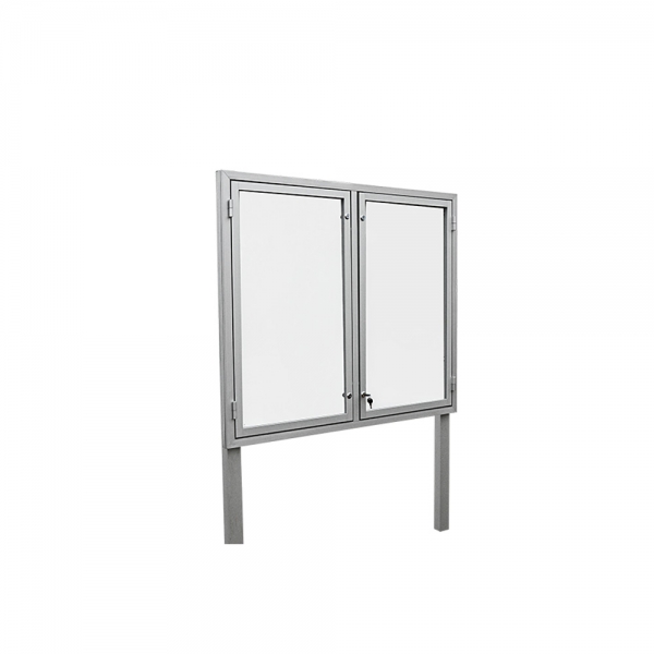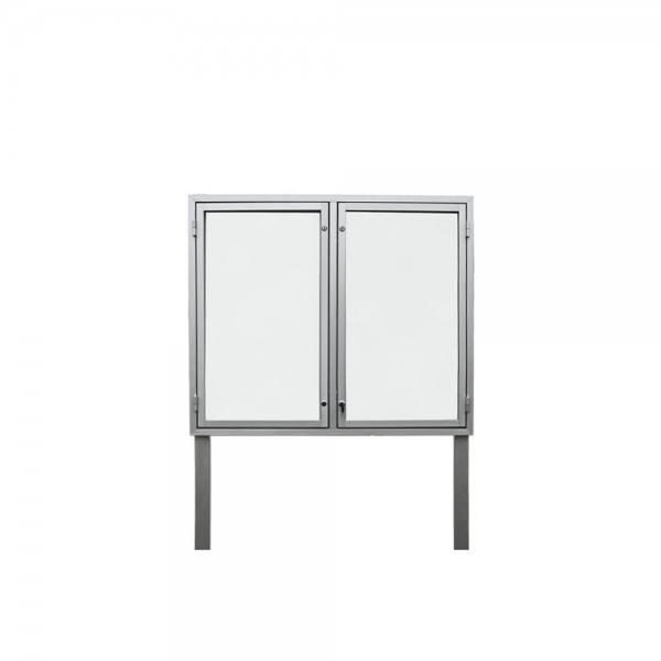 Prezentowana gablota aluminiowa typu WDS3,2 to wolnostojąca, dwuskrzydłowa, otwierana na boki bardzo elegancka gablota informacyjna stworzona na potrzeby prezentacji materiałów w miejscach publicznych. Gablota dwuskrzydłowa zewnętrzna,na konstrukcji wolnostojącej wykonana jest z profesjonalnych profili aluminiowych o głębokości 32 mm oraz kwadratowym profilu, ścinanym pod kątem 45 stopni co niweluje konieczność montażu plastikowych głowic. Profile aluminiowe, które w całości tworzą solidną i trwałą ramę umożliwiają nam produkowanie gablot jednoskrzydłowych, ogłoszeniowych w większych rozmiarach niż standardowe (podane poniżej). Do produkcji gablot aluminiowych, otwieranych na boki używane są szyby hartowane grubości 4 mm. Dno niniejszej gabloty ogłoszeniowej stanowi płyta magnetyczna produkcji niemieckiej, którą standardowo obustronnie malujemy proszkowo na kolor biały. Informacyjna gablota zabezpieczana jest patentowym zamkiem. Prezentowany typ gabloty WDS3,2 jest gablotą informacyjną o przeznaczeniu zewnętrznym, w związku z czym jest ona należycie zabezpieczona systemem uszczelek, które sprawiają, że staje się odporna na warunki atmosferyczne. Gablota zewnętrzna dodatkowo wyposażona jest w otwory wentylacyjne aby zapobiec parowaniu i zamarzaniu szyb. Co do zasady wysokość słupków ustalamy w porozumieniu z Klientem. W standardzie oferujemy wymiary słupka aluminiowego anodowego na kolor srebrny mat : 40 mm x 60 mm x 2,5 mm o długości podstawowej 234 cm oraz 50-60 cm przedłużka. Gablota na nogach nie rdzewieje i jest odporna na działanie czynników atmosferycznych. W celu zapewnienia Naszym Klientom produktu najwyższej jakości do produkcji naszych gablot wykorzystujemy wyłącznie części polskich, duńskich oraz niemieckich z wymaganymi certyfikatami jakości.
