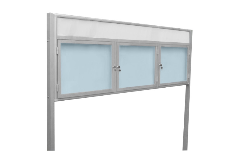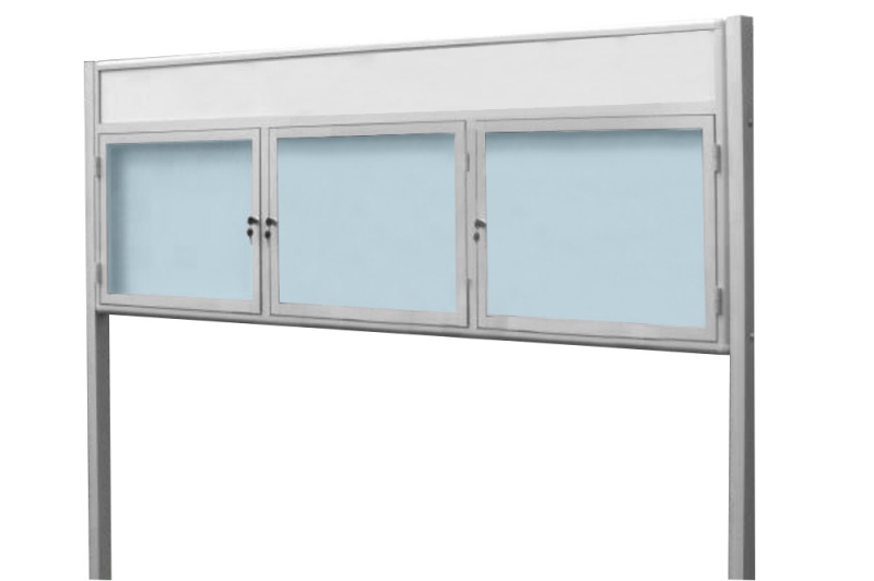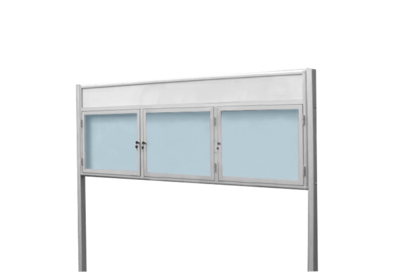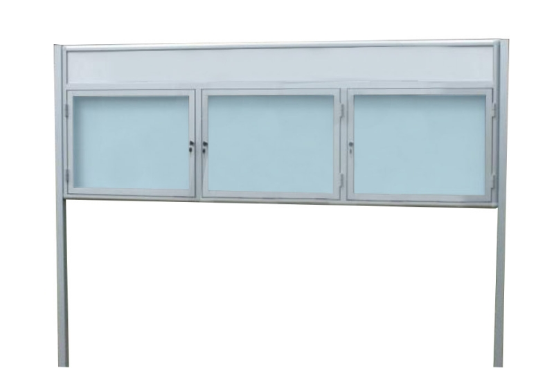 Gablota zewnętrzna, wolnostojąca, aluminiowa, trzyskrzydłowa otwierania na boki z fryzem o grubości gabloty 6cm
