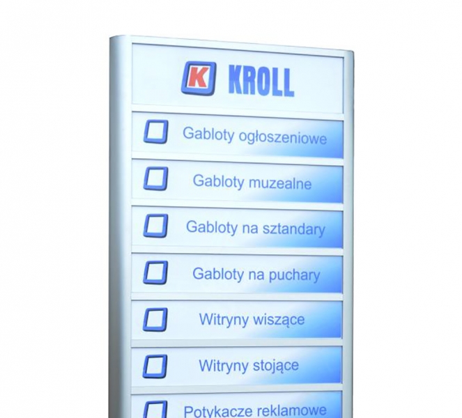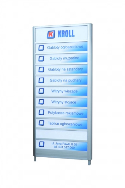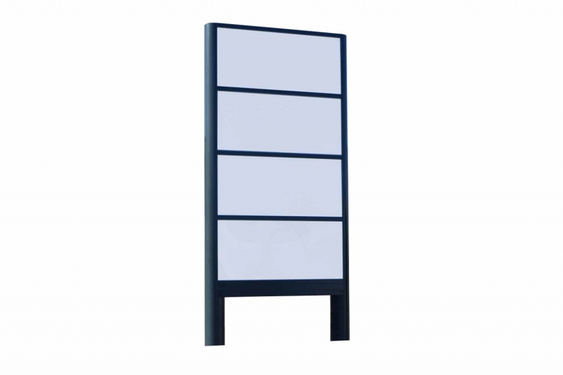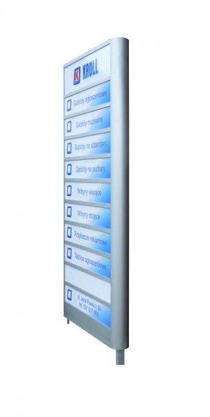 Wysokiej jakości produkt wykonany z części posiadających certyfikat jakości wydany przez państwowe instytucje do tego przystosowane. Pylon nadaje się idealnie do postawienia wewnątrz i na zewnątrz budynku. Głównym zadaniem jest umieszczenie na nim krótkich informacji. Pylon posiada profile aluminiowe Grupy Kęty anodowane na kolor srebrny. Tylna ściana wykonana jest z solidnej białej blachy. Cała konstrukcja oparta jest na słupkach aluminiowych, które trzeba wbetonować w ziemię. Dzięki temu że jesteśmy bezpośrednim producentem istnieje możliwość wykonania tablicy w dowolnym wymiarze i dowolnym kolorze.