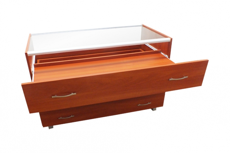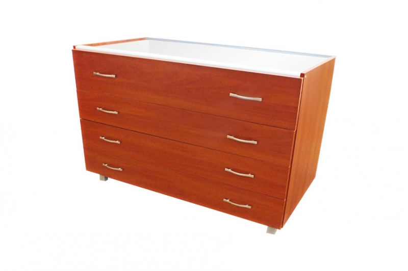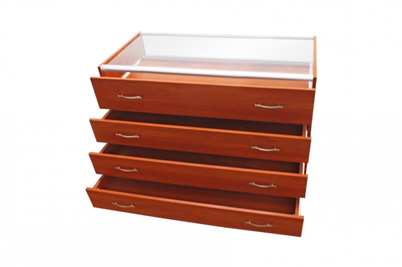 Wysokiej klasy witryna przeznaczona do ekspozycji towarów. Szkielet witryny jest wykonany z profili aluminiowych anodowanych na kolor srebrny (w standardzie) połączonych z elegancką płytą meblową tworzącą dno, boki i wierzch witryny. Witryna wsparta na szafce wykonanej z płyty meblowej, wyposażonej w szuflady. Ścianka górna ze szkła o grubości 4mm. Zawartość witryny eksponowana w górnej szyfkadzue