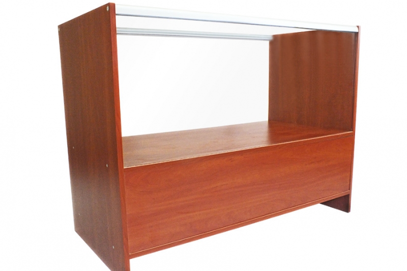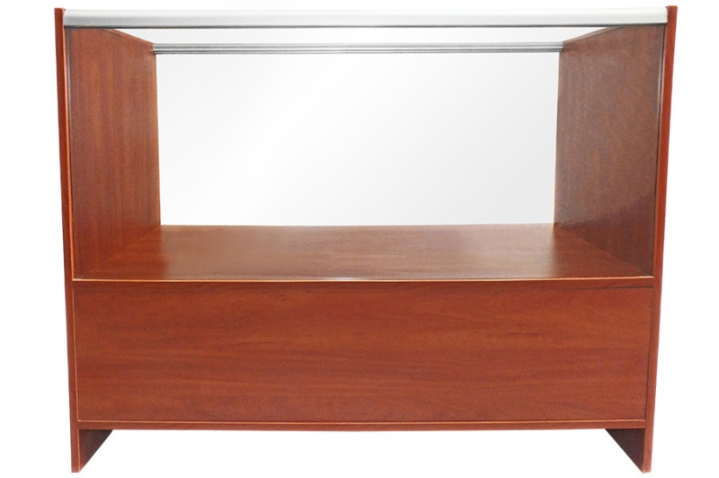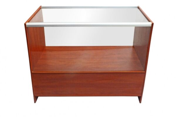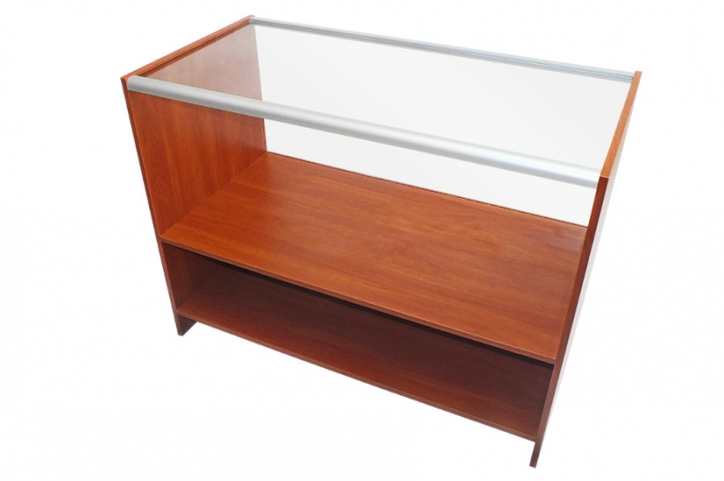 Wysokiej klasy witryna przeznaczona do ekspozycji towarów. Szkielet witryny jest wykonany z profili aluminiowych anodowanych na kolor srebrny mat (w standardzie) połączonych z elegancką płytą meblową tworzącą dno, boki i wierzch witryny. Witryna wsparta na szafce wykonanej z płyty meblowej, wyposażonej w półkę. Sciana przednia i górna ze szkła o grubości 4mm.