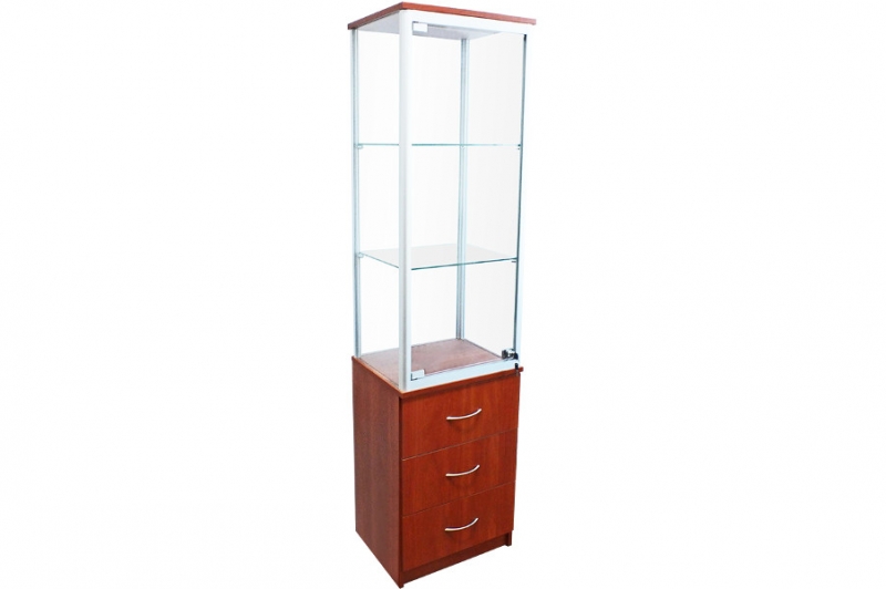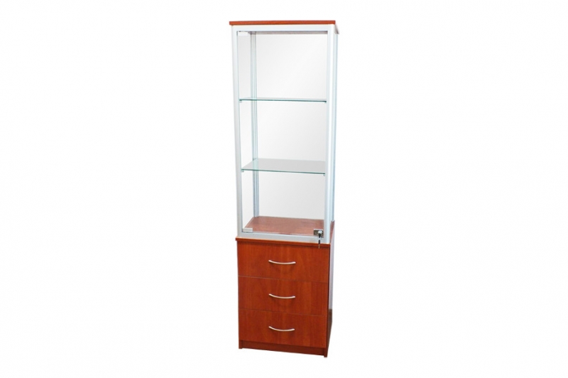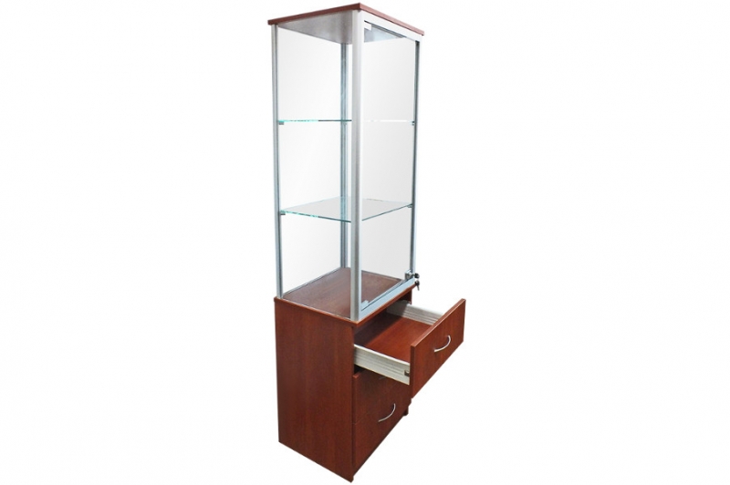 Wysokiej klasy witryna przeznaczona do ekspozycji towarów. Szkielet witryny jest wykonany z profili aluminiowych anodowanych na kolor srebrny mat (w standardzie) połączonych z elegancką płytą meblową tworzącą dno i wierzch witryny. Witryna wsparta na szafce wykonanej z płyty meblowej, wyposażonej w szuflady. Ściany boczne i tylna ze szkła o grubości 4mm. Witryna wyposażona w drzwi jednoskrzydłowe. Półki szklane o regulowanej wysokości.