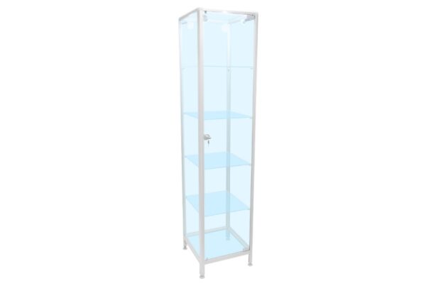 Wysokiej jakości witryna stojąca jest wykonana z najwyższej jakości certyfikowanych materiałów. Witryna stojąca posiada jedno skrzydło otwierane na bok, które można bezpiecznie zamknąć za pomocą zamka patentowego. Dzięki temu przedmioty znajdujące się w środku są bezpieczne. Każda ściana boczna witryny ekspozycyjnej jest wykonana z bezpiecznej szyby hartowanej o grubości 4mm. Ściana górna i dolna jest wykonana z eleganckiej płyty HDF. W środku witryny stojącej wewnętrznej znajdują się solidne szklane półki, które wytrzymują duże obciążenie. Cała konstrukcja jest osadzona w wysokiej jakości profilach aluminiowych, anodowanych na kolor srebrny. Profile są ze sobą połączone za pomocą plastikowych głowic. Jest to bardzo stabilne i trwałe połączenie. Cała konstrukcja jest przeszklona i dzięki temu znajdujące się w środku przedmioty są bardzo dobrze widoczne. Witryna stojąca posiada nóżki dzięki temu można ją postawić w dowolnym miejscu. Dodatkową opcją jest założenie w środku oświetlenia. To sprawi, że wnętrze witryny stojącej jest widoczne nawet w nocy.