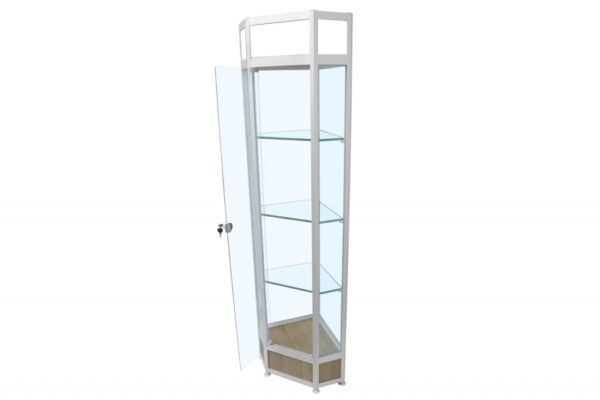 Witryna sklepowa, narożna. Dzięki wysokiej klasy profilom z Grupy Kęty, anodowanym na kolor srebrny-mat gablota tworzy stabilną konstrukcję. Profile łączą się ze sobą za pomocą plastikowych głowic, które wzmacniają całą konstrukcję. Drzwi znajdują się na froncie, otwierane na bok zamykane na zamek patentowy, który chroni wnętrze przed osobami nieupoważnionymi do korzystania z niej. Dół tworzy niewielki cokół z gustownej płyty meblowej, której kolor można wybrać z naszego katalogu według uznania. Pięć boków gabloty tworzy szyba bezpieczna- hartowana. Półki (3 sztuk w standardzie) dopasowane do kształtów witryny pozwalają na zamieszczanie dużej ilości artykułów. W opcji dodatkowej istnieje możliwość zamontowania oświetlenia, które znaczenie lepiej zaprezentuje zamieszczone eksponaty w środku. W górnej części gabloty wewnętrznej stojącej znajduje się mleczny fryz wykonany z płyty plex. Jest to miejsce przeznaczone na umieszczenie specjalnej grafiki wybranej przez klienta.